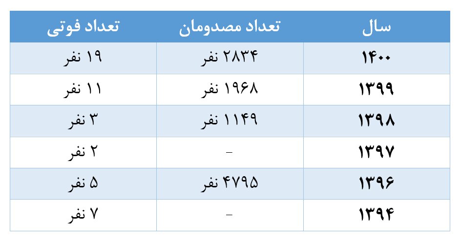 در خصوص تعداد فوتیها هم باید اشاره کرد که از سال ۱۳۹۴ تا ۱۴۰۰، در مجموع ۵۷ فوتی داشتیم. این آمار از سال ۹۴ به بعد یک روند افزایشی را طی کرده است.