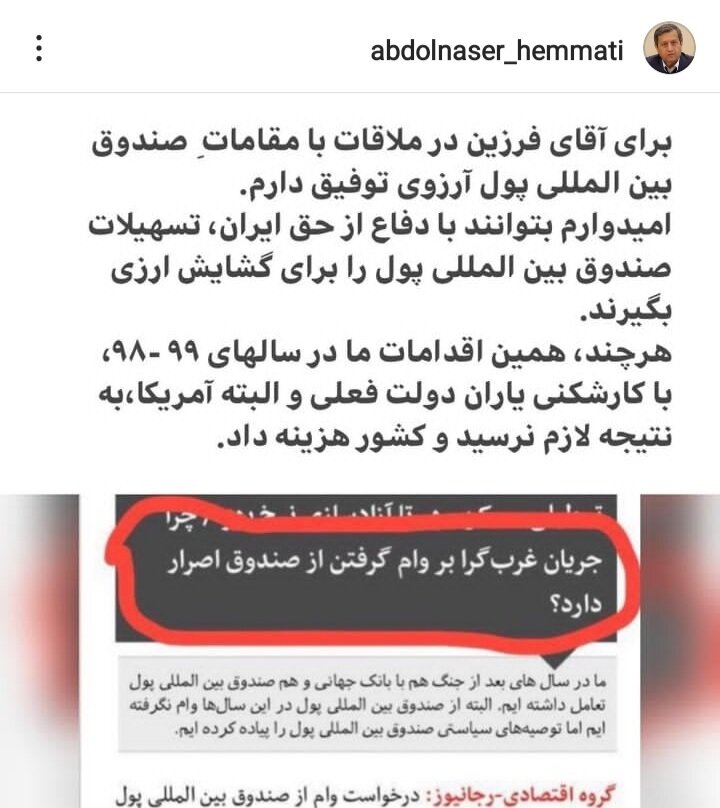 به گزارش خبرگزاری مناطقآزاد، عبدالناصر همتی، رئیس کل اسبق بانک مرکزی در یادداشتی در فضای مجازی با اشاره به حمله مخالفان دولت روحانی به همتی، به خاطر تلاش برای وام گرفن از صندوق بین المللی پول عنوان کرد: «برای آقای فرزین در ملاقات با مقامات صندوق بین المللی ول آرزوی توفیق دارم. امیدوارم بتوانند با دفاع از حق ایران، تسهیلات صندوق را برای گشایش ارزی بگیرند.