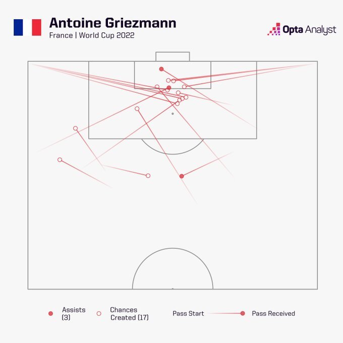 سایت اوپتا با انتشار گرافی از پاسهای کلیدی گریزمان به او لقب مسی جدید را داد و مدعی شد او در فرانسه نقشی مشابه با مسی را ایفا میکند!