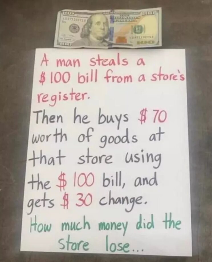 او تصویر یک اسکناس ۱۰۰دلاری و نوشتهای با این مضمون در رسانه اجتماعی ایکس پست کرد: «فردی از فروشگاهی ۱۰۰ دلار میدزدد. سپس با آن ۱۰۰ دلار، از همان فروشگاه کالایی با قیمت ۷۰ دلار میخرد و ۳۰ دلار باقیمانده از فروشنده میگیرد. اکنون فروشنده چقدر ضرر کرده است؟»