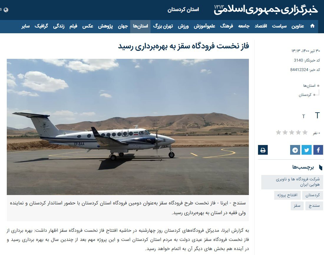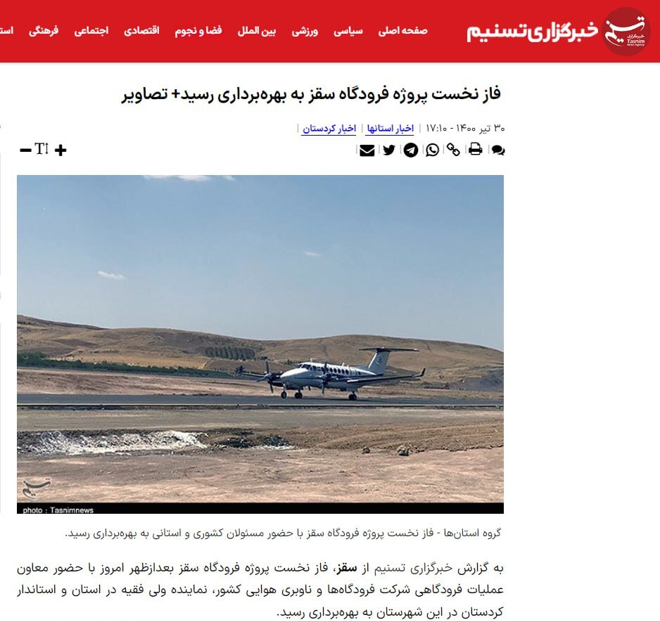 خبرگزاری ایرنا در همین تاریخ مطلبی با تیتر «فاز نخست فرودگاه سقز به بهرهبرداری رسید»، منتشر کرده است. در این خبر تاکید شده است: فاز نخست طرح فرودگاه سقز بهعنوان دومین فرودگاه استان کردستان با حضور استاندار کردستان و نماینده ولی فقیه در استان به بهرهبرداری رسید.