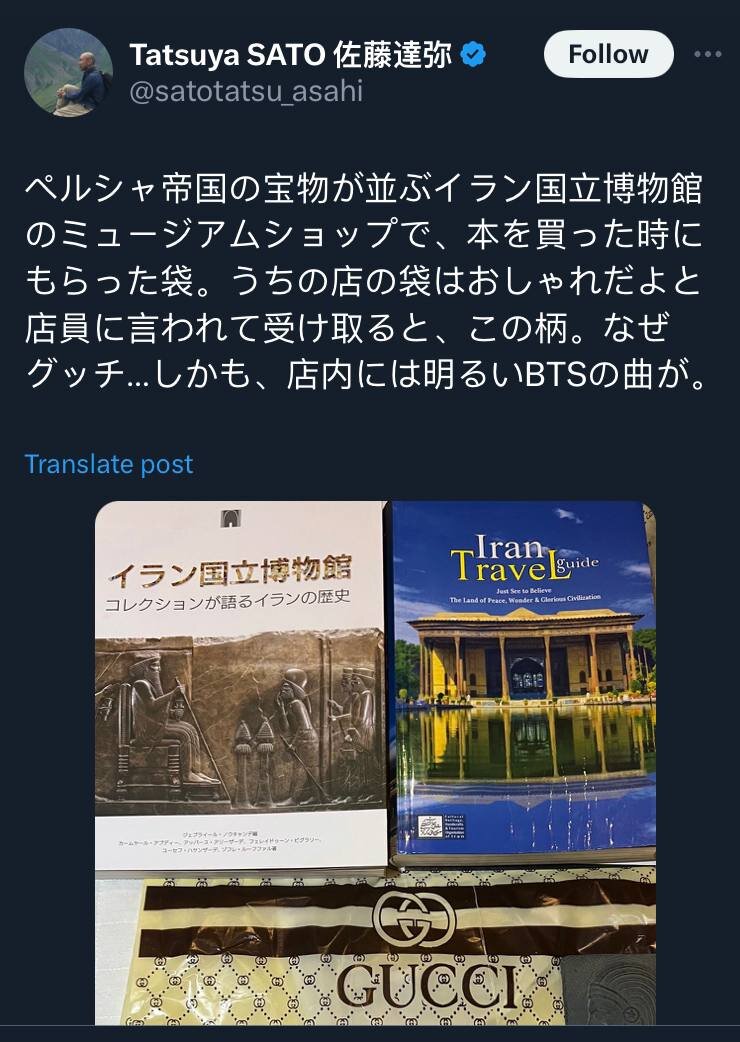به گزارش مناطقآزاد، یک خبرنگار ژاپنی بعد از بازدید موزه ملی ایران در شبکه اجتماعی ایکس(توئیتر سابق) نوشت: «کیسهای که هنگام خرید کتاب از فروشگاه موزه ملی ایران، جایی که گنجینههای امپراتوری ایران در آن ردیف شدهاند، دریافت کردم.(کیسه خرید با آرم برند گوچی). چرا گوچی؟علاوه بر این، آهنگهای BTS (یک گروه موسیقی کرهای) در داخل فروشگاه بود.»