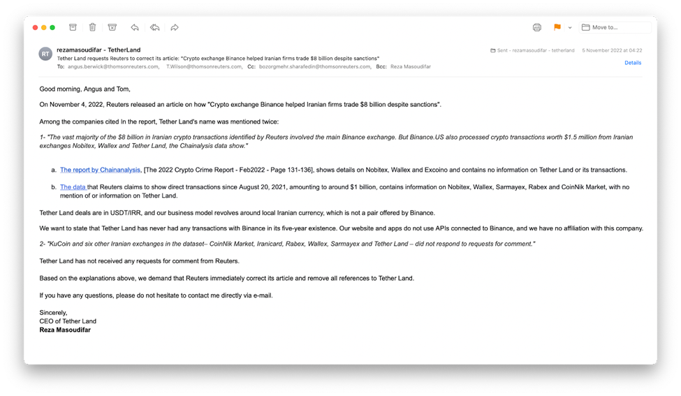 در متن این گزارش که با عنوان «با وجود تحریمها، بایننس به شرکتهای ایرانی کمک کرد تا ۸میلیارد دلار معامله کنند» منتشر شده، دو مرتبه از «تترلند» نام برده شده است. شایان ذکر است که ساعاتی پس از انتشار این گزارش، تترلند دلایل خود را برای کذببودن ادعا و فرضیه مطرحشده رسماً برای رویترز ارسال کرد اما تاکنون و پس از گذشت بیش از ۳ روز، همچنان هیچ پاسخی دریافت نکرده است.