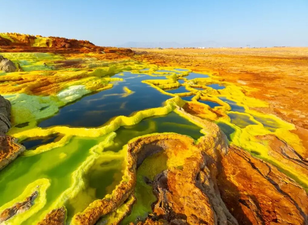 این صحرا به گرمای سوزانی که گاه به ۵۰درجه سانتیگراد میرسد معروف است. همچنین این صحرا پر از آتشفشان و آبفشانهایی است که گازهای بسیار سمی منتشر میکنند. قدم گذاشتن به این صحرا خیلی خطرناک است.