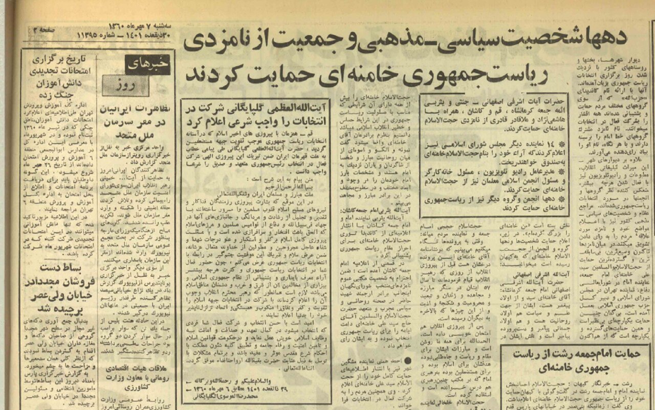 روزنامهی کیهان روز دوشنبه ۳۰ شهریور ۶۰ از حمایت چند چهرهی مطرح از جمله میرحسین موسوی و هاشمی رفسنجانی از ریاستجمهوری آیتالله خامنهای خبر داد و یک روز پیش از انتخابات نیز از حمایت تمامقد چهار رقیب دیگر انتخابات ریاستجمهوری از ایشان گفت. سه روز پیش از برگزاری این دوره از انتخابات ریاستجمهوری اما کیهان (سهشنبه ۷ مهر ۶۰ ص ۲) گزاشی مفصل از حمایت شخصیتهای مهم کشوری را منتشر کرد که بخشی از آنها را در پی میخوانید: