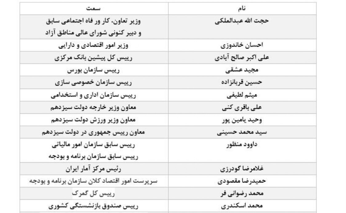 داوود منظور از معاونت مالیاتی وزارت امور اقتصادی و دارایی راهی سازمان برنامه و بودجه شد. میثم نیلی نیز پس از جنجال بسیار بر سر غیرقانونی بودن حضورش در مسند معاونت رییس جمهوری و ریاست سازمان اداری و استخدامی در این پست باقی ماند. رییس کل پیشین بانک مرکزی و رییس سازمان بورس اوراق بهادار یعنی علیاکبر صالح آبادی و مجید عشقی نیز هر دو دانش اموختهی دانشگاه امام صادق بودند.