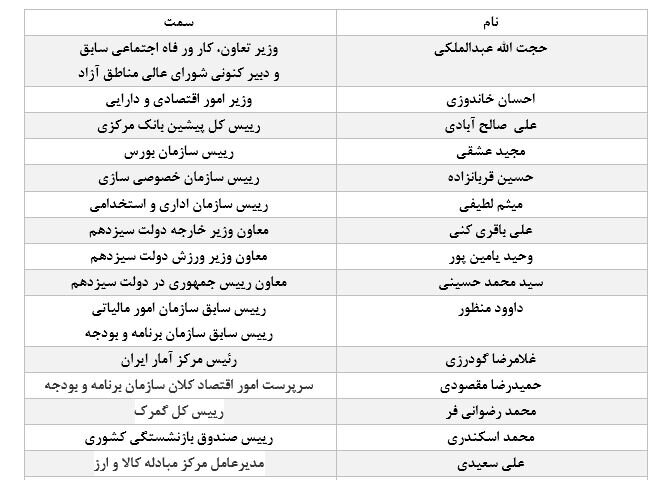 داوود منظور از معاونت مالیاتی وزارت امور اقتصادی و دارایی راهی سازمان برنامه و بودجه شد. میثم نیلی نیز پس از جنجال بسیار بر سر غیرقانونی بودن حضورش در مسند معاونت رییس جمهوری و ریاست سازمان اداری و استخدامی در این پست باقی ماند. رییس کل پیشین بانک مرکزی و رییس سازمان بورس اوراق بهادار یعنی علیاکبر صالح آبادی و مجید عشقی نیز هر دو دانش اموختهی دانشگاه امام صادق بودند.