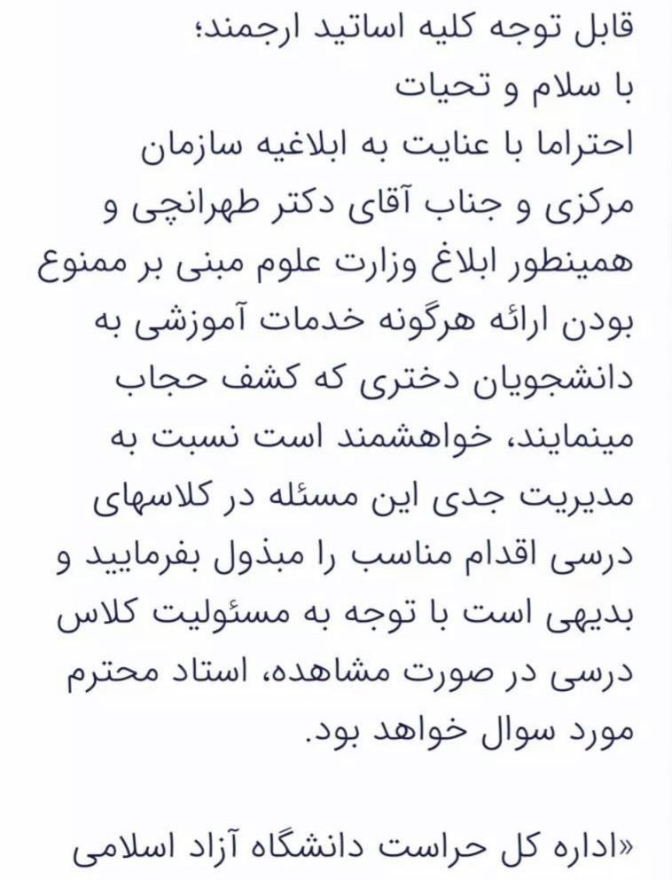 به گزارش مناطقآزاد محسن برهانی در حساب توئیتری خود نوشت: «دانشگاه آزاد با زبان تهدید، اساتید را ملزم به تذکر دادن در خصوص حجاب دانشجویان کرده است.