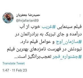 کارشناسان برنامه های سینمایی تلویزیون نیز حذف «غریب» از جمع بهترین فیلم ها را اتفاقی عجیب دانستند. امیر قادری منتقد برنامه «هفت» در این باره گفت: «مثل روز برایم روشن بود که سر «غریب» را می برند، چون در بین بهترین فیلم ها نبود.»