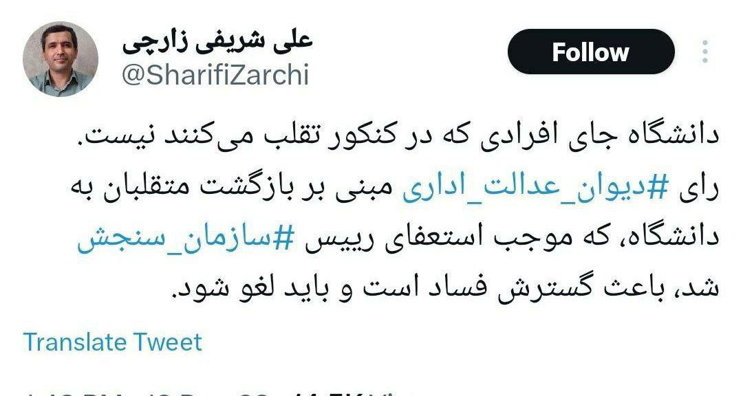 علی شریفیزارچی در شبکه اجتماعی ایکس (توئیتر) نوشت: دانشگاه جای افرادی که در کنکور تقلب میکنند نیست. رای دیوان عدالت اداری مبنی بر بازگشت متقلبان به دانشگاه، که موجب استعفای رییس سازمان سنجش شد، باعث گسترش فساد است و باید لغو شود