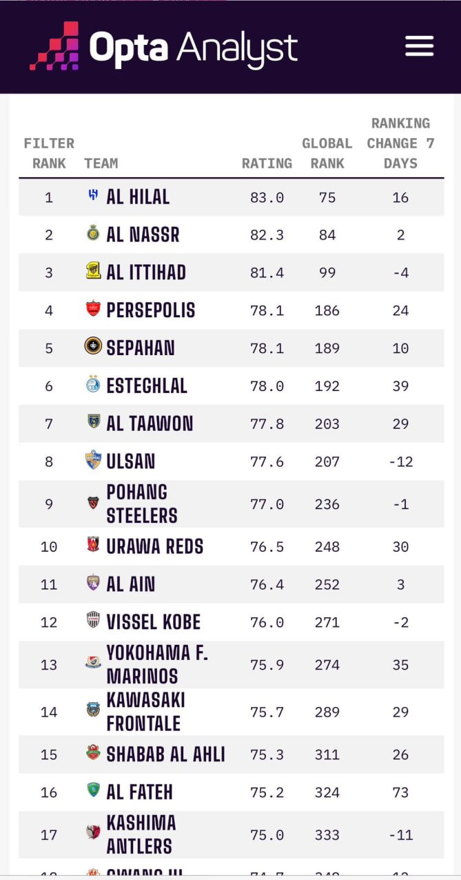 شبکه «اوپتا» رده بندی جدید باشگاه های فوتبال آسیا را اعلام کرد که در این رده بندی باشگاه های ایران و عربستان سردمدار فوتبال آسیا شدند.