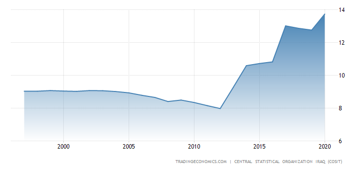 همچنین نرخ بیکاری در عراق روند افزایشی دارد. در سال ۲۰۱۲ این نرخ ۸ درصد و در سال ۲۰۲۰ به حدود ۱۴ درصد رسیده است. تجمعات زیادی برای بیکاری و نبود اشتغال در عراق اتفاق افتاد، بعلاوه بیکاری در قشر جوان بیشتر بوده است!