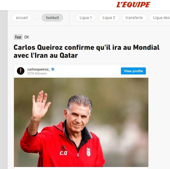 نشریه معتبر «اکیپ» فرانسه در واکنش به حضور رسمی کارلوس کی روش در تیم ملی ایران نوشت: کارلوس کی روش به صورت رسمی حضورش در ایران را تایید کرد و برای سومین بار با این تیم در رقابت های جام جهانی شرکت خواهد کرد.