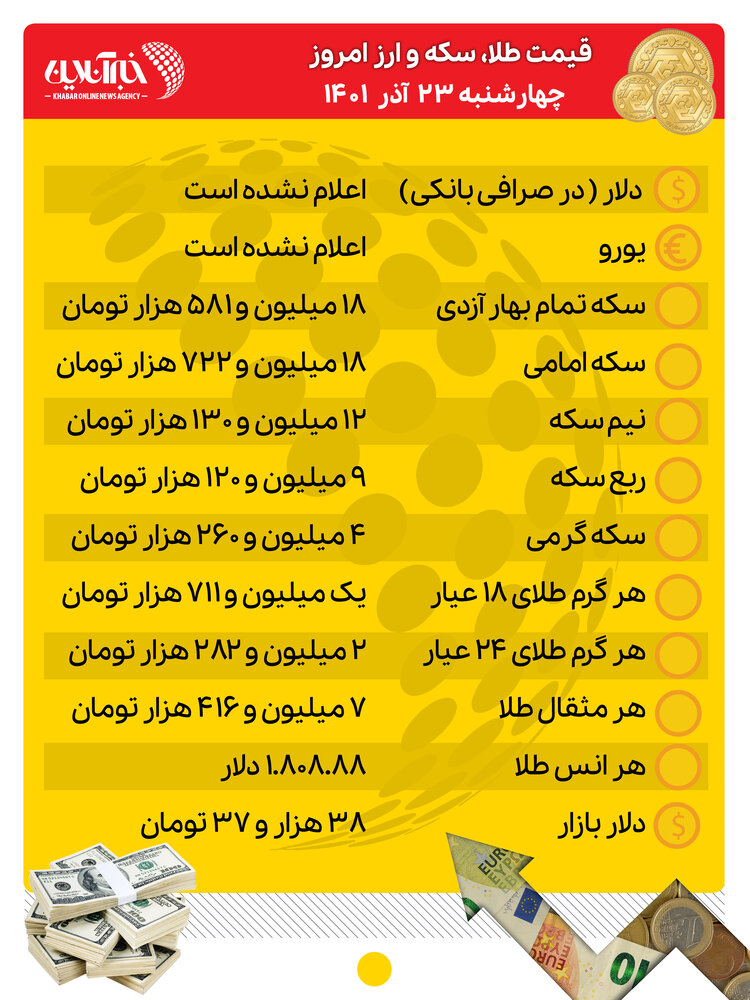قیمت انواع ارز و سکه و طلا را در روز چهارشنبه، بیست و سوم آذرماه ۱۴۰۱ را مشاهده می کنید.
