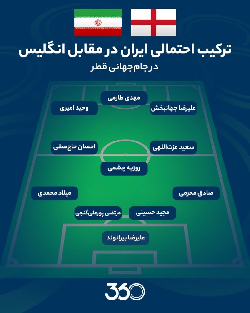 به گزارش خبرگزاری مناطقآزاد، تیم ملی فوتبال کشورمان در اولین دیدار خود در جام جهانی از ساعت ۱۶:۳۰ به مصاف انگلیس می رود. ترکیب احتمالی تیم ملی در این دیدار می تواند، روزبه چشمی،مرتضی پورعلی گنجی، مجید حسینی، علیرضا بیرانوند، سعید عزت اللهی، وحید امیری، علیرضا جهانبخش، احسان حاج صفی، صادق محرمی، مهدی طارمی و میلاد محمدی باشد.