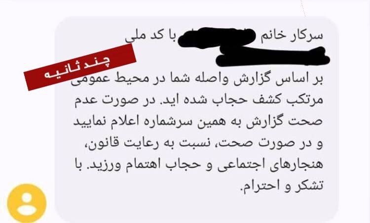 در این پیامک آمده است: براساس گزارش واصله شما در محیط عمومی مرتکب کشف حجاب شدهاید. در صورت عدم صحت گزارش به همین سرشماره اعلام نمایید و در صورت صحت، نسبت به رعایت قانون، هنجارهای اجتماعی و حجاب اهتمام ورزید. با تشکر و احترام.