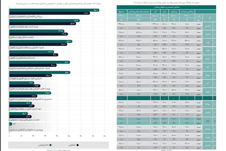 برایناساس بیش از ۵۰ درصد از شرکتکنندگان درباره عوامل مهاجرت در حوزه سلامت، معتقد بودند بیثباتی اقتصادی و اجتماعی در ایران، وجود فساد نهادینه شده در کشور و شیوه حکمرانی مهمترین عوامل تاثیرگذار بر مهاجرت است. حدود ۵۰ درصد از شرکتکنندگان دانشجو و شاغل در بخشهای سلامت این تحقیق هم معتقدند که خارج از ایران کیفیت زندگی بهتری در انتظار آنهاست و فقط دو درصد برای پیوستن به خانواده و آشنایان قصد خروج از کشور را دارند.